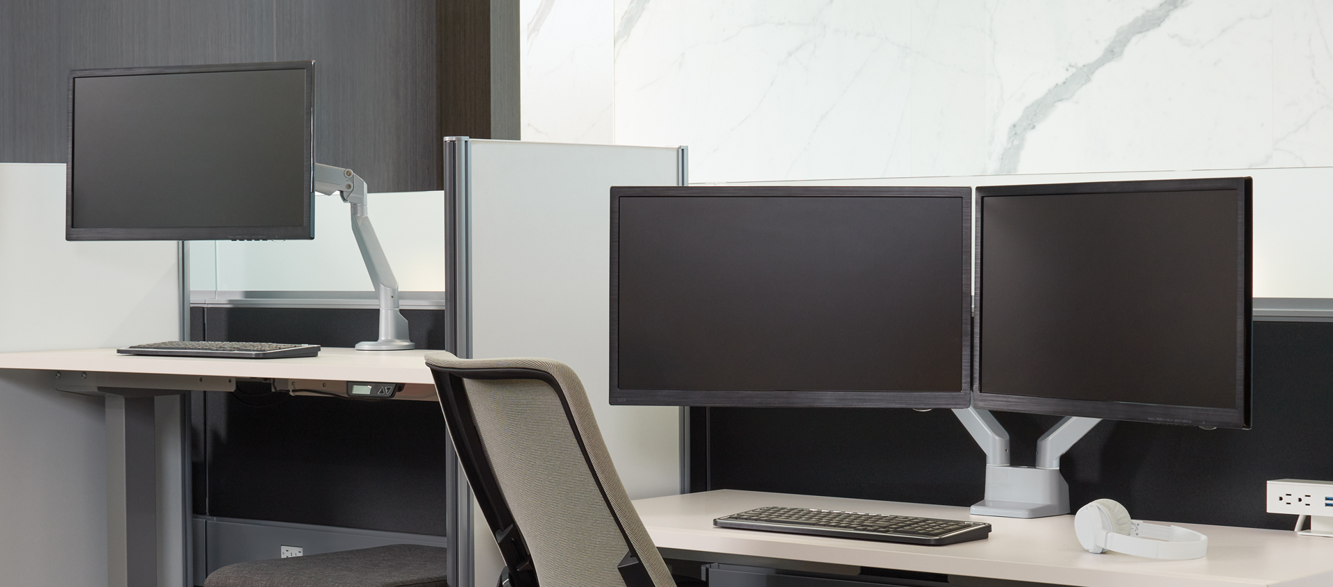 Facility Solutions Plus offers monitor arms in single and dual configurations, with clamp and grommet mounting options to accommodate different work surface types. We help clients select arms with the appropriate weight capacity, range of motion, and mounting compatibility for their specific monitors and workstations.