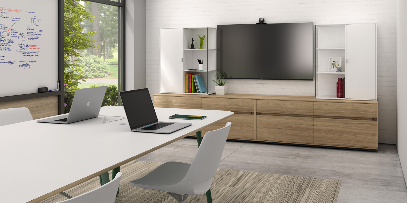 - Conference rooms: AV supply storage and additional work surfaces